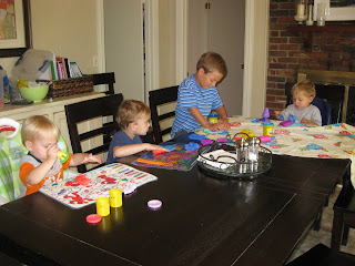 This morning I kept the boys' good friends Caleb and Seth. They have such fun playing together. I got out the playdough for them and it lasted all of 10 minutes, but they enjoyed it. And then the little guys ran to the front door to watch the lawnmower. Entertainment is so easy for these little boys!